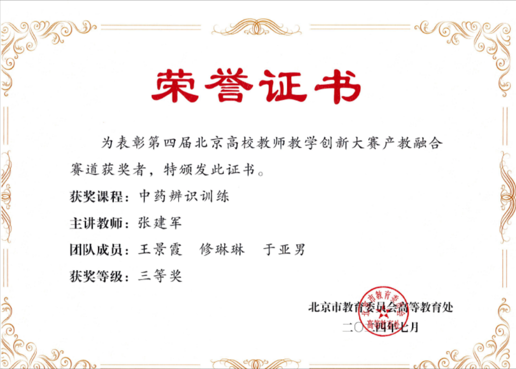课程组荣获第四届北京高校教师教学创新大赛产教融合赛道三等奖,参与的中医基本技能训练Ⅰ入选北京市思政课程示范课程、授课教师入选课程思政教学团队。课程组参与的中医基本技能训练Ⅰ、Ⅱ(线下线上混合式一流课程)荣获成人小说 一流课程建设点项目、参与的中医基本技能训练教学团队荣获成人小说 优秀本科育人团队。团队教师修琳琳获第十二届北京市青教赛医科类一等奖,课程负责人张建军教授获得优秀指导教师奖。张建军教授、王淳教授、王景霞教授荣获成人小说 教学成果二等奖。张建军教授入选成人小说 “岐黄英才·教学名师培育计划”。(图4)