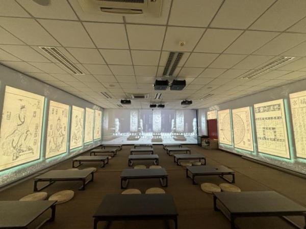 “医心史志”全景沉浸式体验教室位于成人小说 A座5楼,自楼梯间开始便为建设部分,古风场景为同学们营造沉浸式氛围。主体教室采用360度全景投屏营造沉浸式效果,目前教室可容纳90人以内的班级进行课程使用。已有3部自制中医体验场景(中医历史大事记、火与灸、针灸铜人)以及多个与传统文化相关的体验场景(如春夏秋冬、千里江山图等)以供使用,并逐渐投入到中国医学史、中医文献学、中医古籍美学赏析等课程中。