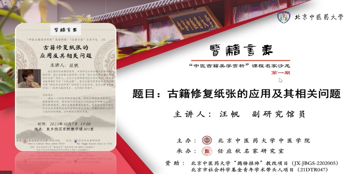 本课程成功举办中医古籍美学赏析“医籍言美”名家沙龙,邀请了“浙江省汪帆古籍修复导师工作室”领办人汪帆副研究馆员,进行了题为《古籍修复纸张的应用及其相关问题》的讲座,开拓了学生的审美视野,从纸张的文化载体领略中医古籍之美。