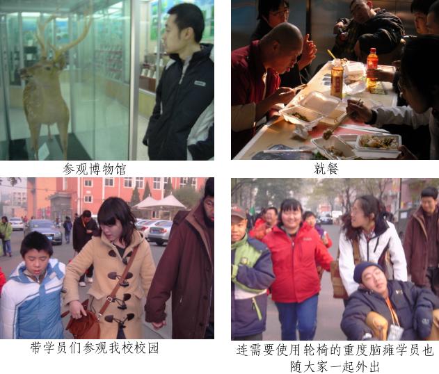 这次活动的意义是特别的,真正的关爱不仅仅是身体上的和物质层面的,更加应该是心灵上的和精神层面的。身有残疾,走到何处这样一群人都会引来别人异样的关注,但是还是那句话,他们和我们一样,都有生活在阳光下的权利,而且我由衷的感觉到社会各界对他们的重视和关心,假如没有便利的设施,轮椅学员无法从方庄搭乘地铁来到我们的学校;博物馆的工作人员给予一行人免票优惠并给予了诸多照顾;食堂的老师为一行人专门收拾出了六张餐桌并擦拭干净,以方便他们就餐等等……