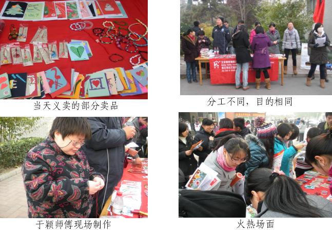 通过几次接触,我们对于智障人士这个群体和慧灵这个机构有了初步的了解,也结交了很多朋友,杜英志老师就算是我们的老朋友了,鉴于三原色工作坊的性质,我们萌生了邀请他们来校园义卖的想法。在徵得了保卫处老师的同意后,紧接着参观活动,11月18日,义卖组来到了我们的学校。