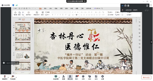 为深入挖掘新时代医德内涵,切实强化医学生廉洁从医意识,2025年4月22日 晚 18 时,成人小说 硕士第二党支部携手 2022 级卓越中西医中日班,成功举办了以“杏林丹心,医德惟仁 —— 医学生视角下的新时代医德内涵与八项规定精神探讨” 为主题的分享会。此次活动旨在以思想交流为笔,勾勒医德轮廓,为医学生的职业精神培根铸魂。