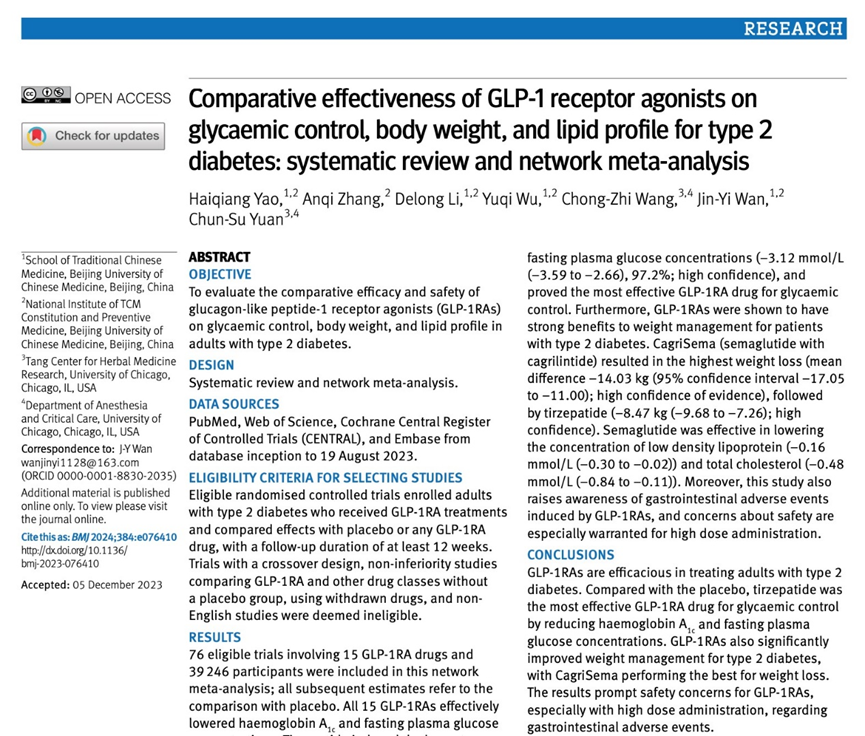 近日,成人小说 万瑾毅副研究员、姚海强副研究员带领团队,与芝加哥大学Chun-Su Yuan终身讲席教授团队合作,针对GLP-1RA药物对2型糖尿病患者血糖水平、体重控制、血脂情况以及用药安全性等多方面作用开展了系统而详尽的评价研究。相关研究成果以“Comparative effectiveness of GLP-1 receptor agonists on glycemic control, body weight, and lipid profile for type 2 diabetes: systematic review and network meta-analysis”为题发表于顶级医学期刊英国医学杂志(BMJ-British Medical Journal,IF 107.7)。