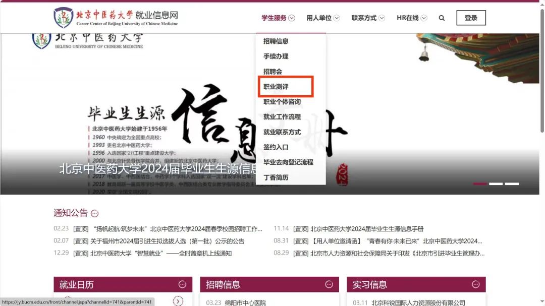 1) 若使用电脑端登录,可打开我校就业信息网网址://jy.crxiaoshuo.org/,打开页面后,点击上方“学生服务”一栏,选择“职业测评”。