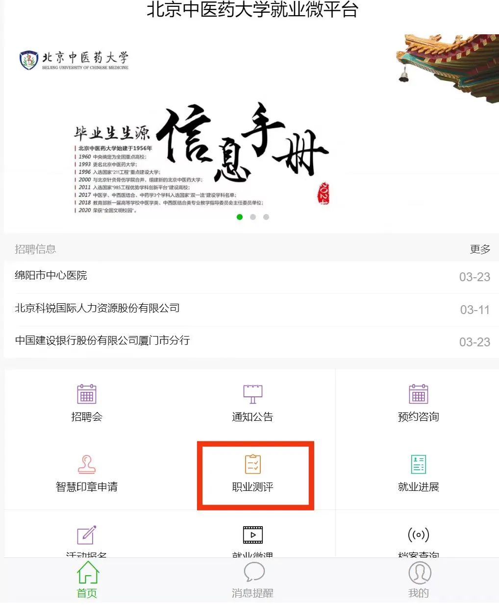 首先关注微信公众号“成人小说 就业指导中心”,点击左下方“学生服务”,进入“成人小说 就业微平台”,选择“职业测评”。