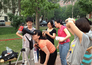研究生会精心为全校师生设置了一个观测站。观测站架设两台望远镜以供观测,并为同学详细讲解了有关本次天文现象的相关内容。