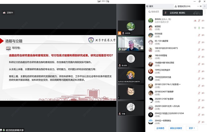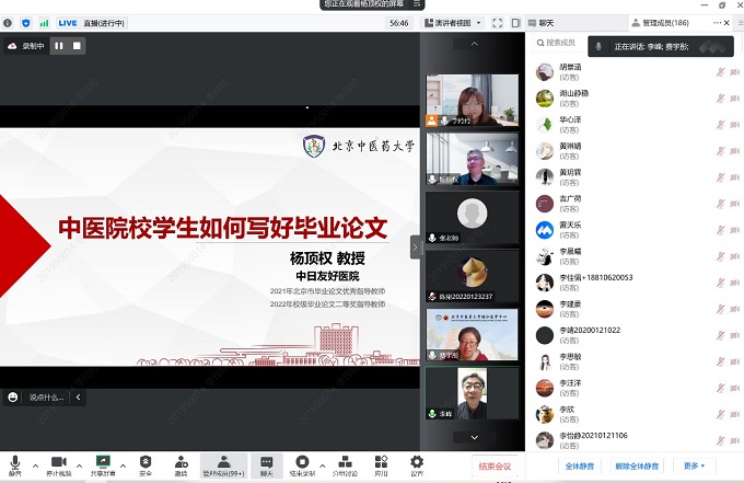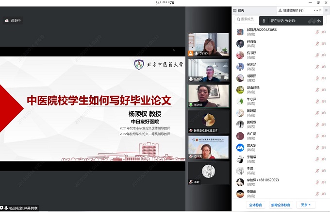 讲座开始前,李峰院长表示本科毕业论文的撰写和答辩是学术成长的里程碑,在教育部不断提升对论文的监控以及质量要求的背景下,有幸请来了杨老师做此次讲座,希望同学们能够认真学习;在疫情复杂的形势下,希望同学能够仍然坚持学习,走好自己的学术之路。费宇彤副院长再次表达了感谢,并勉励同学们继续认真学习。张宏杰老师对北中医学生表示肯定,欢迎大家对中日友好医院进一步了解,希望同学们认真学习此次讲座。