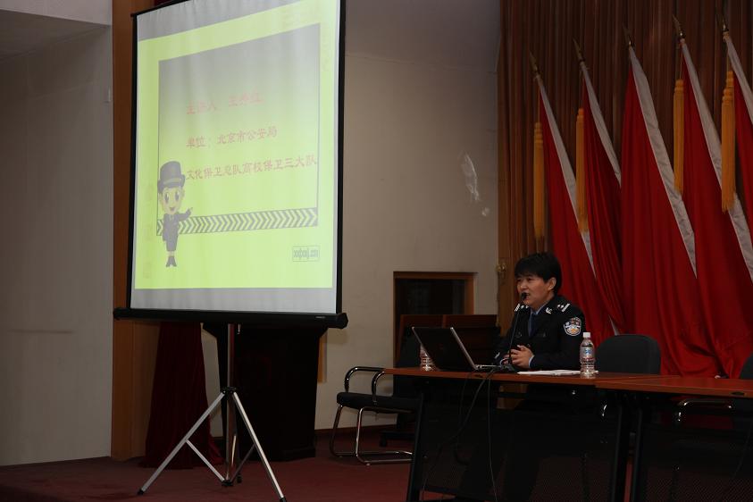 讲座特聘请北京市公安局文化保卫总队第三大队科长王秀红警官主讲,主管科研、安全工作的李峰副院长和主管学生工作的党总支杜伟副书记出席会议并讲话。